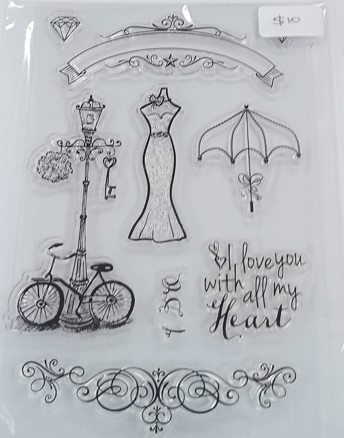 Capture the magic of love and vintage elegance with the Timeless Romance Stamp Set. Featuring graceful illustrations like a streetlamp with a hanging flower basket, a flowing gown, a vintage bicycle, and ornate flourishes, this set evokes the charm of old-world romance. Perfect for weddings, anniversaries, or heartfelt notes.