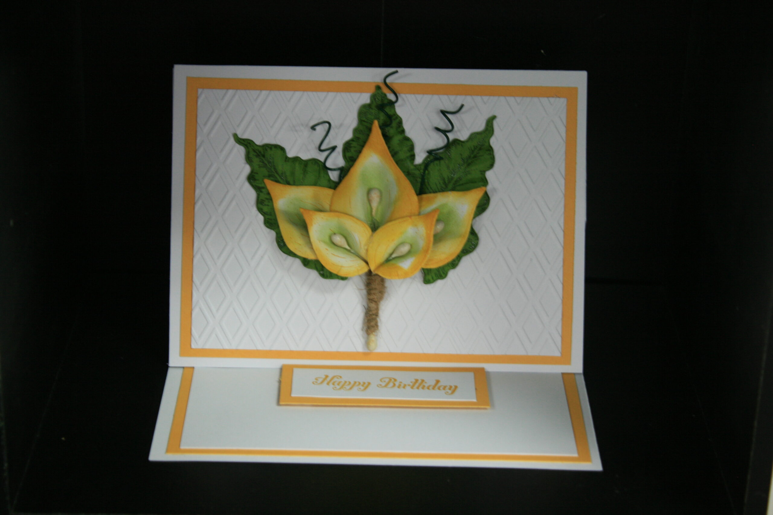 Featuring an elegant bouquet of yellow and white calla lilies, the three‑dimensional floral arrangement lifts from the card. Framed by a textured background and finished with a classic Happy Birthday sentiment this card is a thoughtful, keepsake‑worthy way to celebrate someone special.