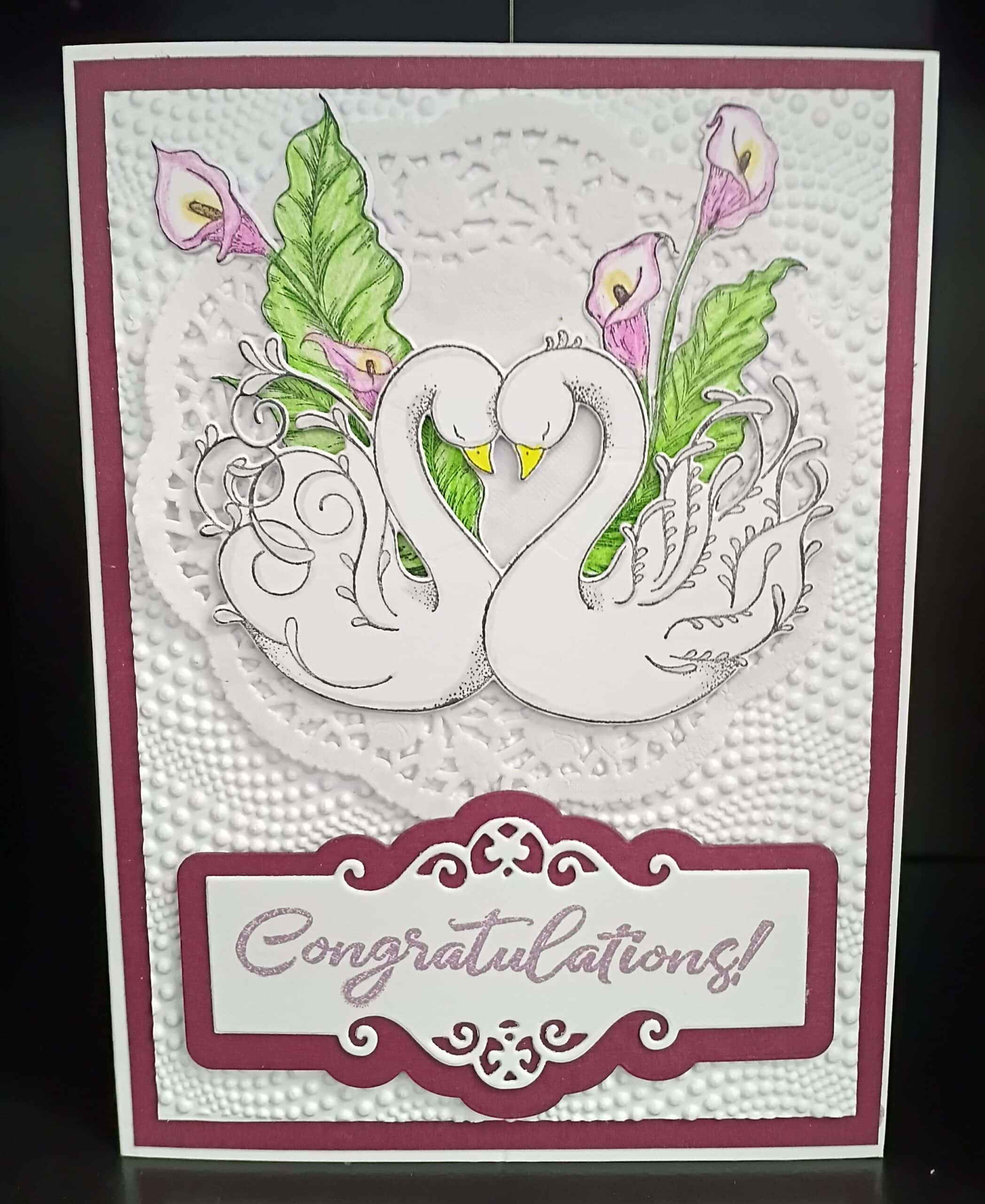 Celebrate life’s most meaningful moments with this elegant swan‑themed congratulations card. Featuring two graceful white swans forming a heart with their necks, surrounded by soft greenery and delicate pink lilies, this design captures the beauty of love, unity, and new beginnings. The ornate “Congratulations!” banner adds a touch of classic sophistication, making this card perfect for weddings, engagements, anniversaries, civil unions, or any romantic milestone.