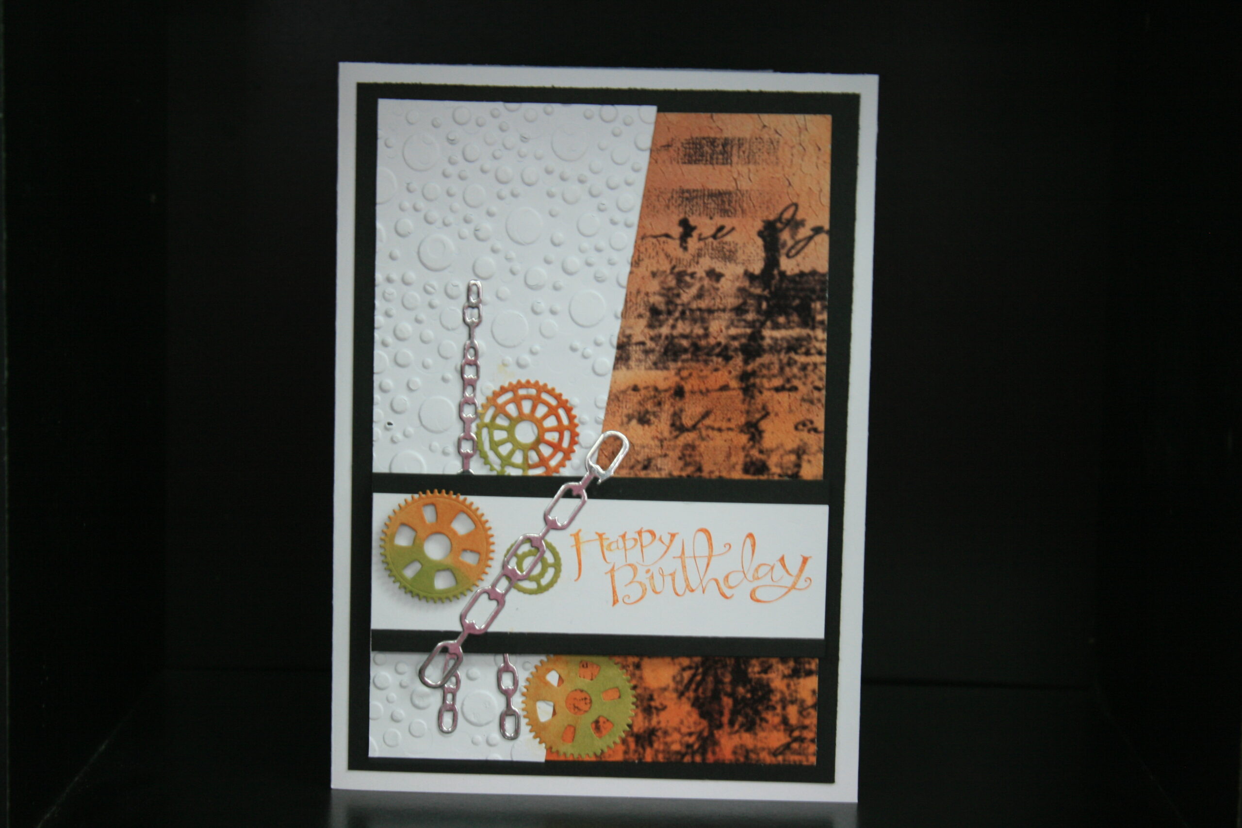 A bold handmade birthday card with an industrial twist, featuring layered textures, embossed details, and colourful gears linked with metallic chain accents. Finished with a striking Happy Birthday sentiment, this mixed‑media design is perfect for anyone who loves industrial style, quirky art, or something a little out of the ordinary.