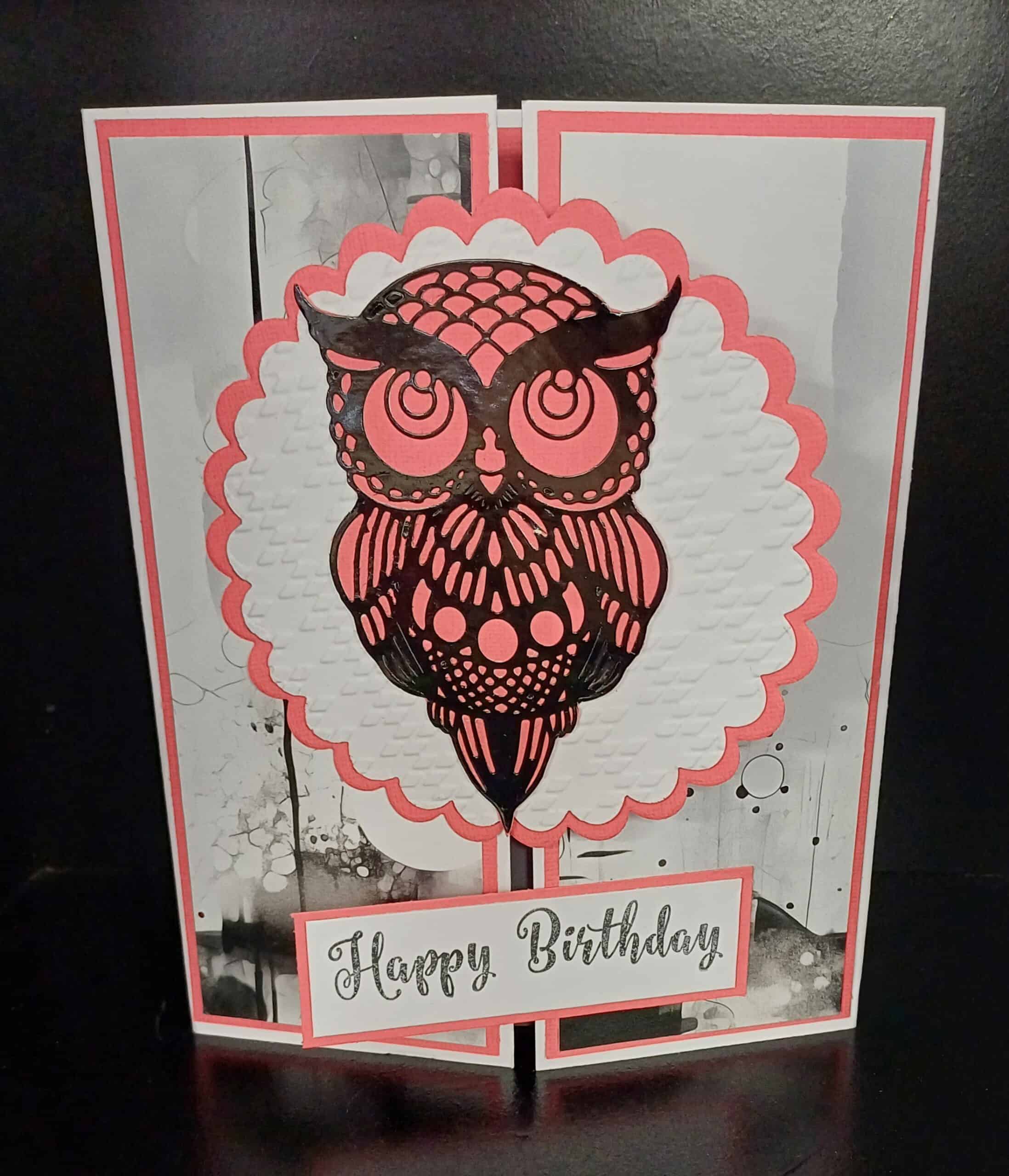 This card feels bold, artistic, and delightfully unexpected. The stylized owl perched across the gatefold panels gives it a sense of mystery and wisdom, while the black and pink color palette adds a modern, edgy twist.