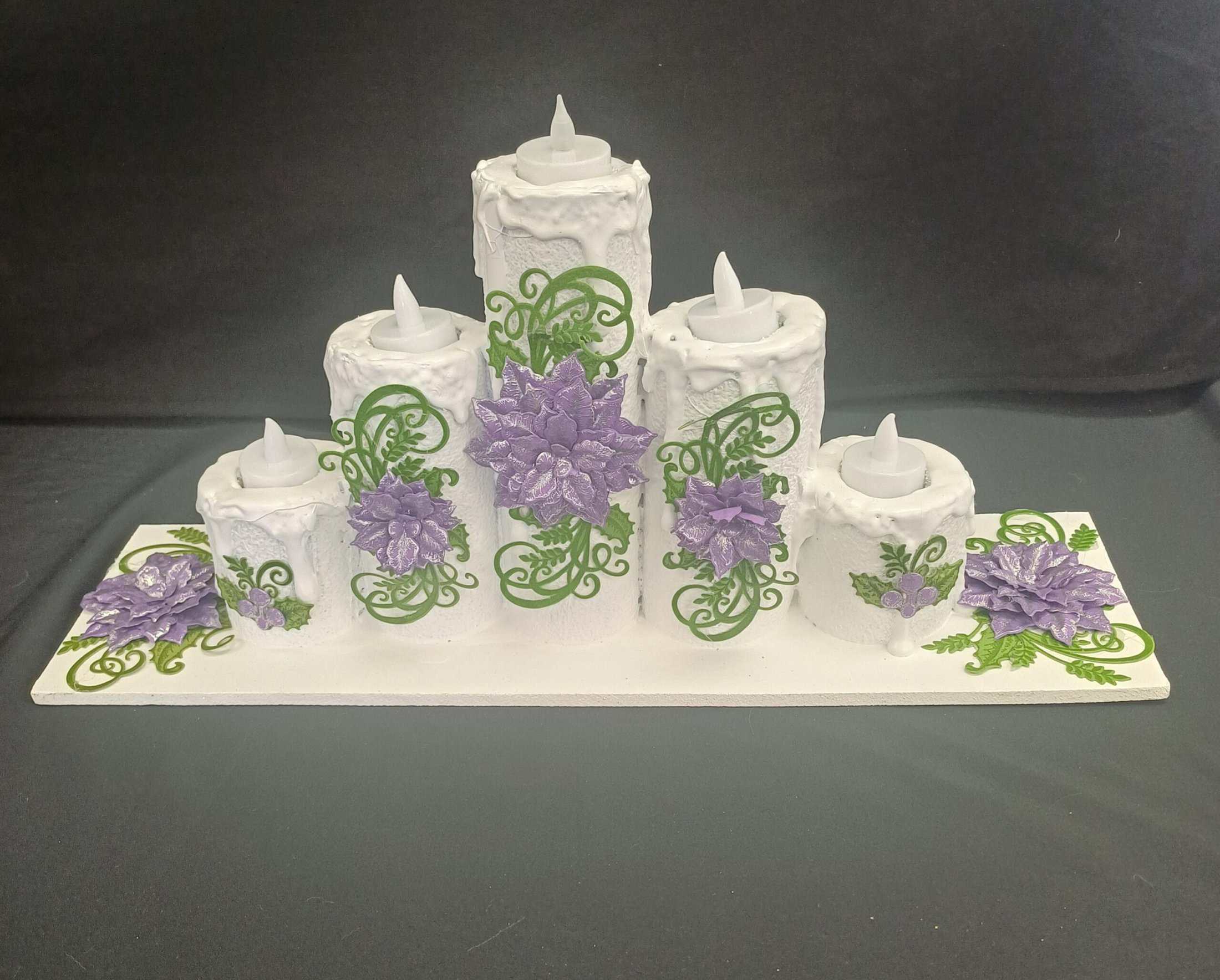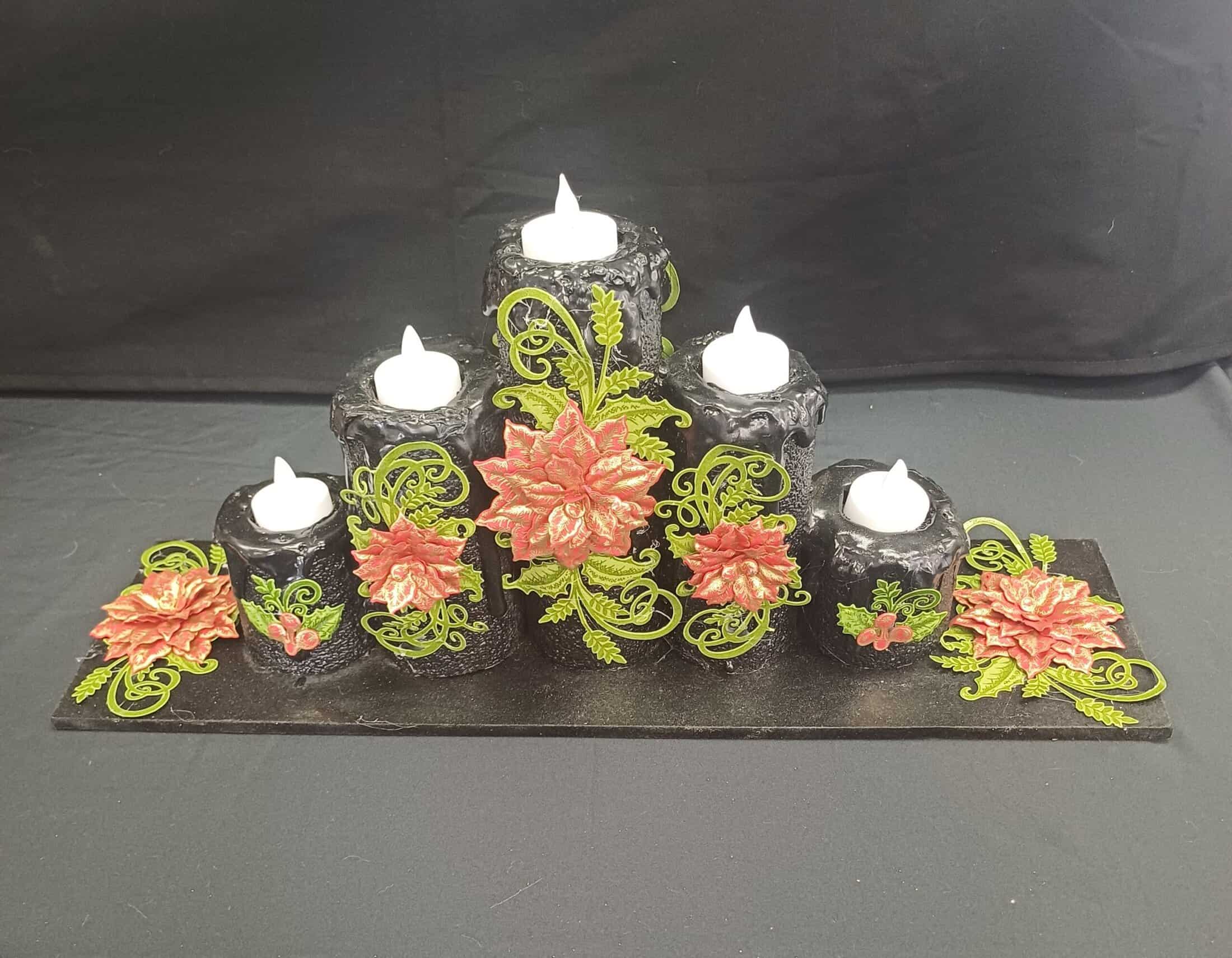 Celebrate the season with this elegant, handcrafted candle arrangement, designed to bring warmth and charm to your holiday décor. Featuring five black cylindrical candles arranged in a pyramid-style formation, each topped with a soft white flameless LED flame, this piece offers cozy ambiance with a modern twist.